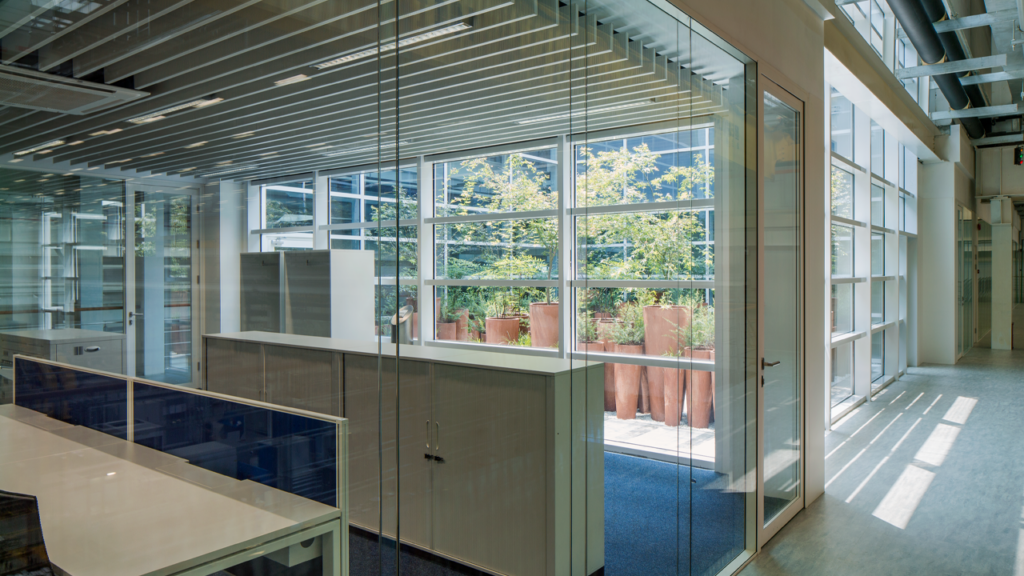 Entlang der zentralen Büroachse öffnen sich begrünte Innenhöfe, die Tageslicht, Ruhe und Aufenthaltsqualität bieten. So entsteht eine enge Verbindung von Verwaltung und Produktion – eine zeitgemäße Interpretation der Idealfabrik, die Kommunikation, Transparenz und Identifikation fördert.