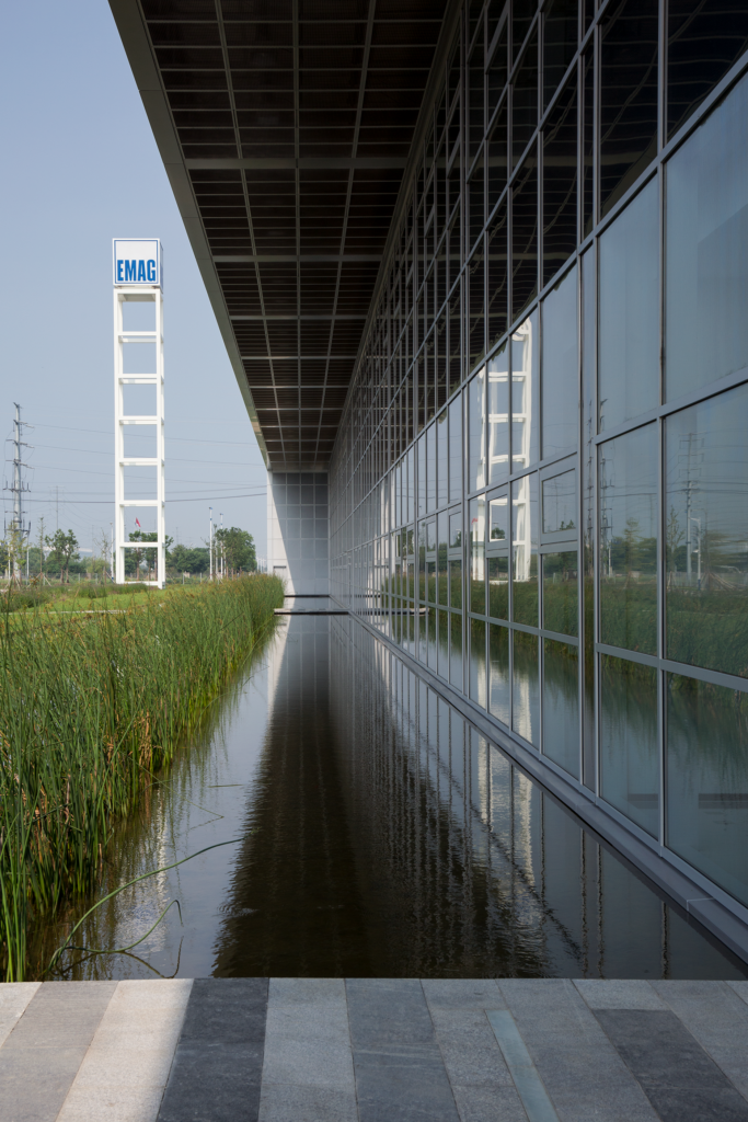 Der neue Standort präsentiert sich entlang der Straße selbstbewusst und einladend. Ein markanter Turm mit EMAG-Logo und ein weit auskragendes Dach prägen den ersten Eindruck. Das große Vordach schützt vor Sonne und Regen und greift zugleich ein zentrales Motiv traditioneller chinesischer Architektur auf.