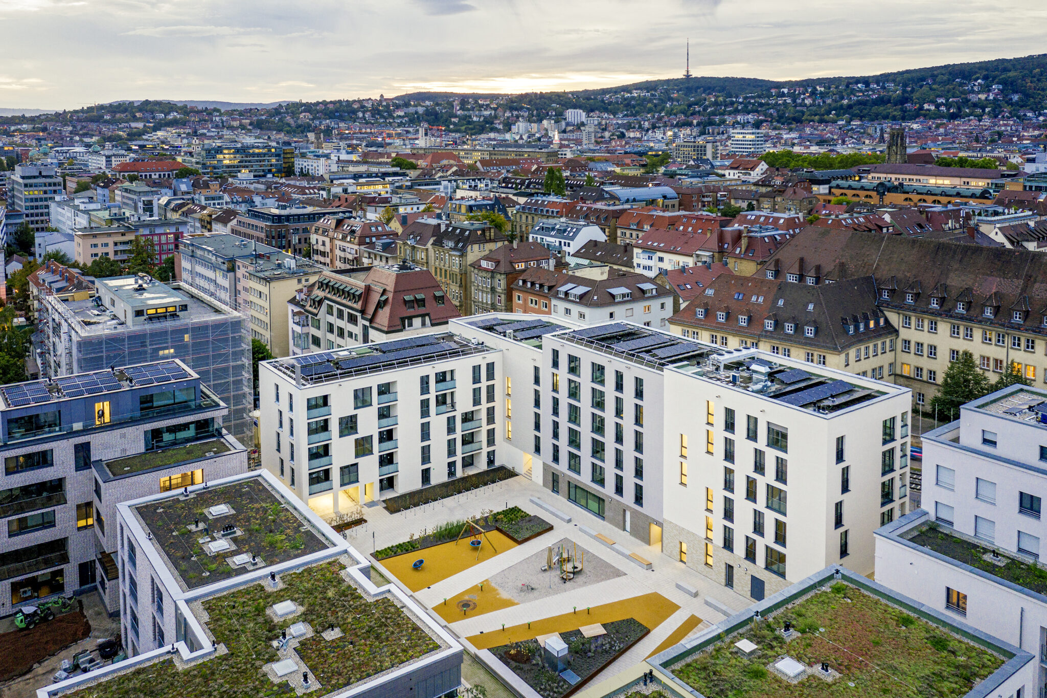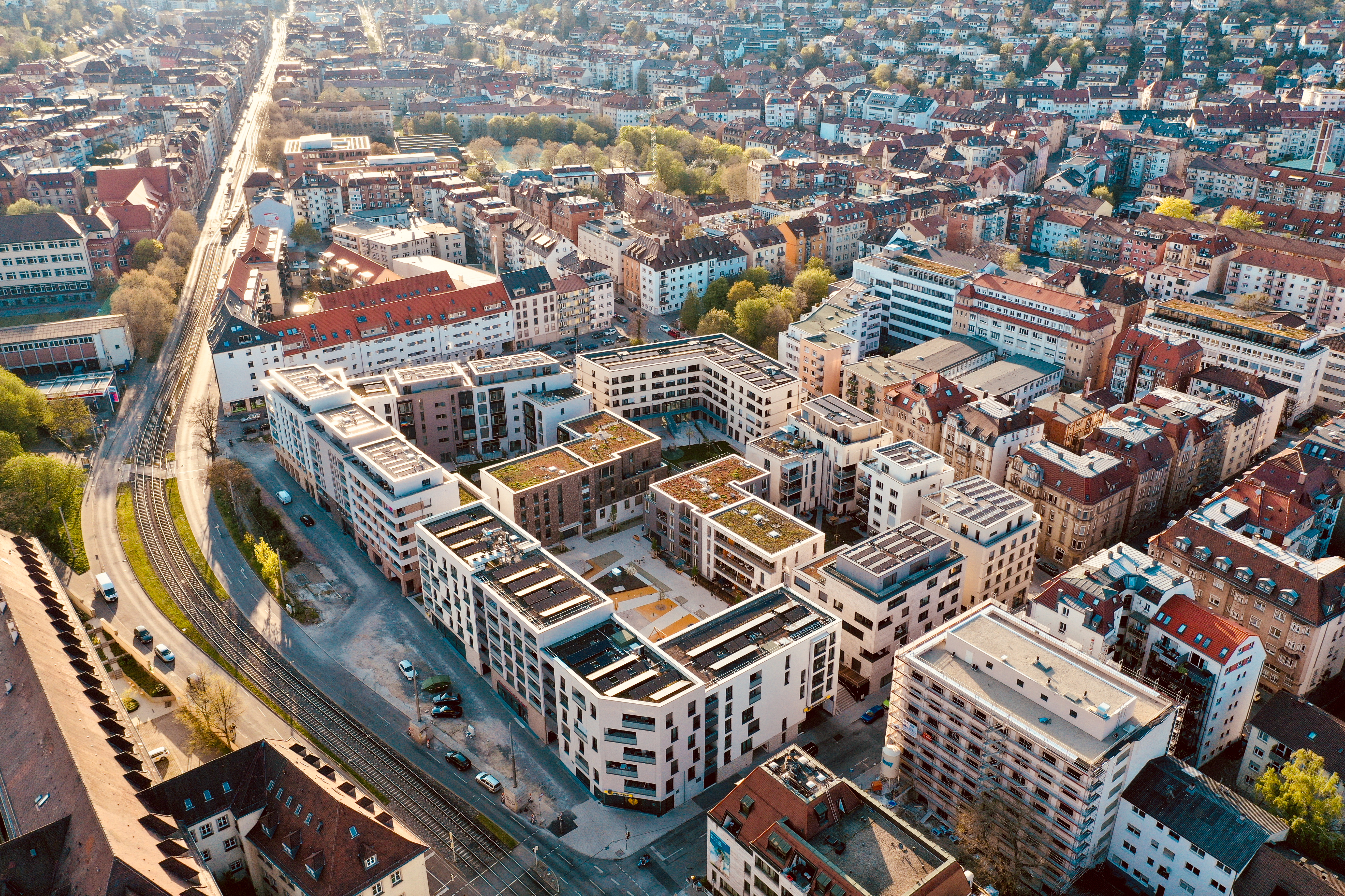 Das Olga-Areal entwickelt sich zu einem typischen Stück Stuttgarter Westen – Baufeld 4 spielt dabei eine Schlüsselrolle. An der prominenten Ecke zur Schlossstraße gelegen, wird der Baukörper zum Gesicht der Stadt in Richtung Zentrum. Trotz seiner Größe wirkt der Bau durch die typische Körnung des Viertels kleinteilig: Vier terrassiert angeordnete Häuser folgen dem Gelände. Charakteristisch gegliedert durch den für den Westen typischen Bauwich mit modern interpretierten, zurückgesetzten Loggien in Dunkelgrau. Unterschiedliche Farben und Materialien von Stein und Putz betonen die Gliederung und lassen ein Ensemble individueller Stadthäuser entstehen.